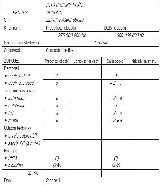 Jednotliví vedoucí zaměstnanci, kteří mají převzít odpovědnost za realizaci navržených cílů, vepíší své požadavky na zdroje (viz tabulka) a převedou je na finanční parametry ve dvou variantách: