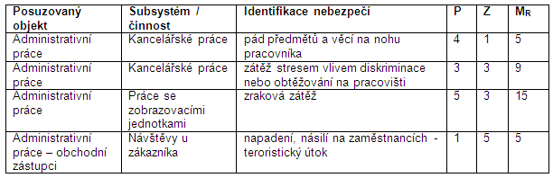 V našem krátkém příkladu je použit pro jednoduchost výpočet míry rizika: MR= P x Z