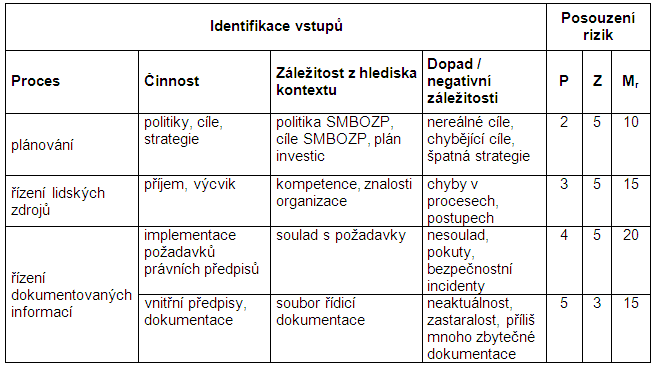 Pozn.: Na rozdíl od ISO 9001:2015, která sice rovněž požadavek na určování rizik obsahuje, ale v jejím obdobném čl. 6.1.1 není stanovena povinnost dokumentovaných informací, v rámci SMBOZP (stejně jako v EMS) je dokumentace týkající se rizik a příležitostí povinná.