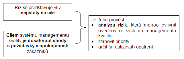 Ustanovení čl. 4.4 (Systém managementu kvality a jeho procesy): organizace musí mj. řešit rizika a příležitosti, stanovené v souladu s požadavky;