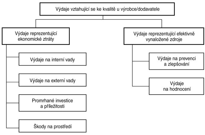 Nelze ale začít jinak než vysvětlením pojmu "výdaje vztahující se ke kvalitě u výrobce/dodavatele“. Výchozí definici termínu "výdaje vztahující se ke kvalitě“ můžeme najít v britském standardu BS 4778, kde jsou výdaje vymezeny jako "souhrn výdajů, které musejí vynaložit všechny zainteresované strany ve vztahu ke kvalitě určitého produktu nebo procesu“. Tato definice je velmi neurčitá, nicméně umožňuje rozdělit celkové výdaje vztahující se ke kvalitě do tří základních skupin:
