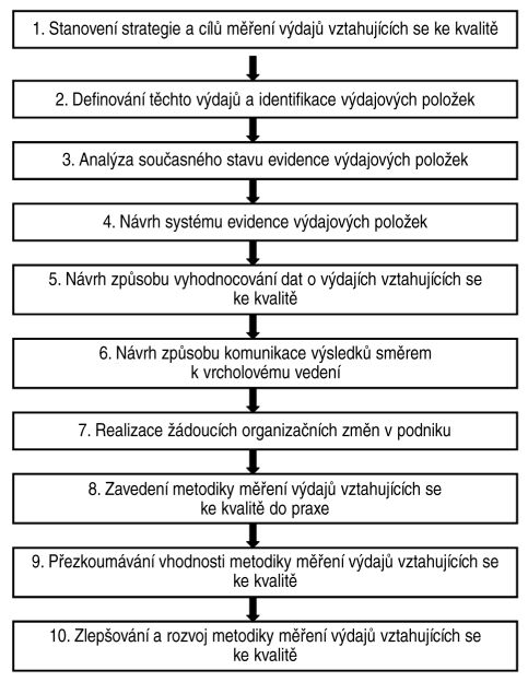 Doporučený postup při tvorbě metodiky měření výdajů vztahujících se ke kvalitě, předpokládající uskutečnění deseti hlavních kroků, je znázorněn na následujícím obrázku.