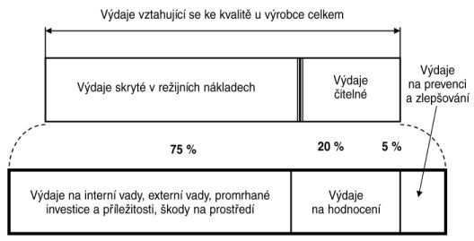 Následující obrázek ilustruje obvyklou počáteční situaci ve struktuře výdajů vztahujících se ke kvalitě, kdy jsou tzv. čitelné položky významnou menšinou v porovnání s položkami skrytými v režiích. Navíc lze v počátcích sledování těchto výdajů odhalit i jejich nepříznivou strukturu: výdaje na prevenci a zlepšování totiž tvoří pouze nepodstatnou část celkových výdajů vztahujících se ke kvalitě v porovnání s výdaji, které jsou vyvolány neschopností výrobce (dodavatele) plnit požadavky.